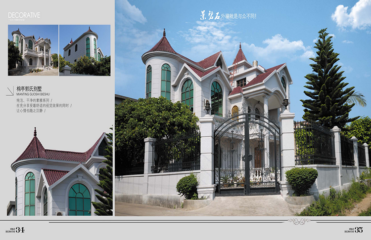 適用于山莊別墅、酒店、賓館、娛樂場所、商業會所等建筑物內外墻大面積使用。